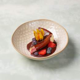 Утиная ножка конфи, картофельное пюре, морковное пюре, сливочное масло, ягодное варенье, демиглас, зеленое масло