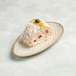 Корж / белок, сахар, фисташка дробленная, кукурузный крахмал, крем / сливки 33%, сливочный сыр маскарпоне начинка / свежие ягоды малины, декор / фисташка дробленная, голубика