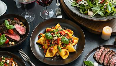 Зеленая гречка, томленая конина, соус демиглас, сыр качотта, шнит лук, сливки, шампиньоны