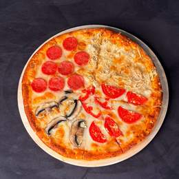 Пицца соус, тесто для пиццы, моцарелла, шампиньоны, говяжья ветчина, орегано, салями из говядины, помидоры