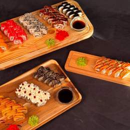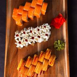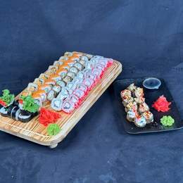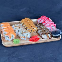 Калифорния 10шт, цезарь запеченный 10шт, темпура краб 10шт, темпура лосось запеченный 10 шт, банита 10шт, капа маки 10шт, бейша 10шт