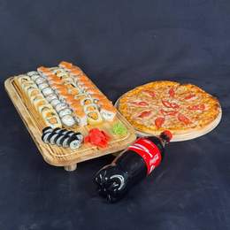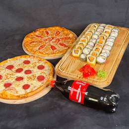 Филадельфия 10шт, калифорния 10шт, банито 10шт, цезарь жареный 20шт, темпура лосось 10 шт, пицца маргарита 1шт, пицца пепперони 1шт, 1л кола 1шт