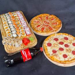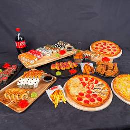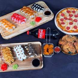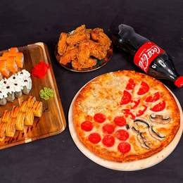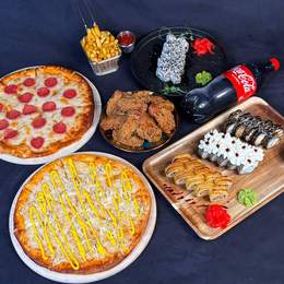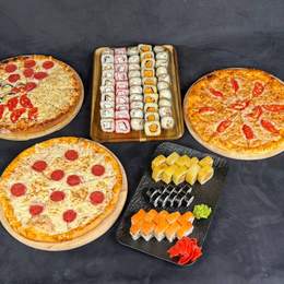 Филадельфия 10шт, филадельфия гриль 10шт, калифорния 10шт, греческий ролл 10шт, канада 10шт, капа маки 10шт, цезарь жареный 10шт, темпура краб 10шт, темпура лосось 10 шт, цезарь запеченный 10шт, темпура краб запеченный 10шт, фри 1 порция, сырные палочки 1порция, крылышки 8шт, 1л кола 1шт, пицца 4-сезон 1шт, пицца пепперони 1шт, пицца куриная 1шт