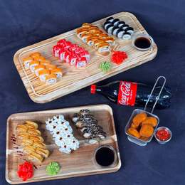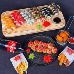 Филадельфия 10шт, калифорния 10шт, капа маки 10шт, цезарь запеченный 10шт, темпура лосось 10 шт, греческий ролл 10шт, канада 10 шт, наггетсы 8шт, фри 1порция (200г), сырные палочки 1 порция, 1л кола 1шт