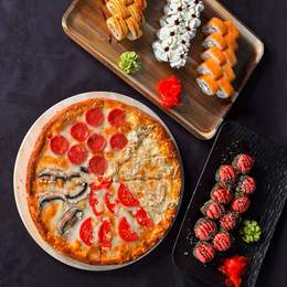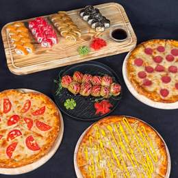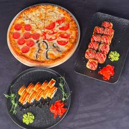 Филадельфия 10шт, калифорния 10шт, банито 10шт, капа маки 10шт, цезарь жареный 20шт, темпура лосось 20 шт, пицца маргарита 1шт, пицца 4-сезона 1шт, пицца пепперони 1шт