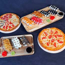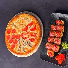 Филадельфия 10шт, калифорния 10шт, цезарь жареный 10шт, цезарь запеченный 10шт, темпура лосось 10шт, пицца пепперони 1шт, пицца куриная 1шт, пицца 4-сезон 1шт