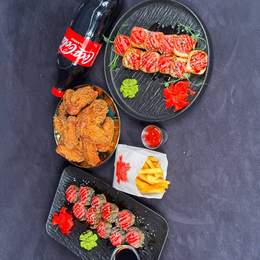 Цезарь запеченный 10шт, темпура краб запеченный 10шт, фри 2 порция, крылышки 8шт, 1л кола 1шт