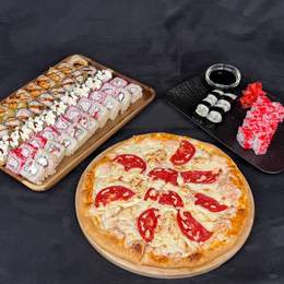 Филадельфия 10шт, калифорния 10шт, капа сяке 10шт, капа маки 10шт, кани маки 10шт, цезарь жареный 10шт, темпура краб 10шт, темпура лосось 10 шт, чиз ролл 10шт, пицца маргарита 1шт, пицца 4-сезона 1шт