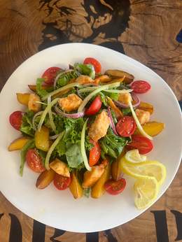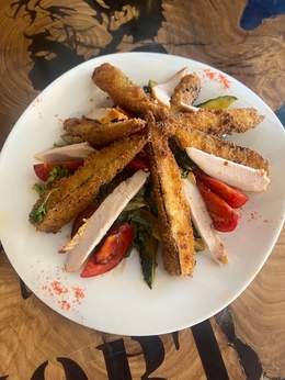 Куриная грудка на гриле , овощи на гриле , булгур , горох нут , перепелиные яйца , ароматная омега 3,6 заправка , микс из зелени