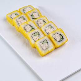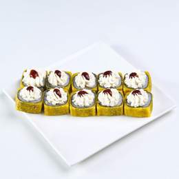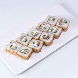рис для суши, водоросли нори, лосось, угорь, огурцы, сливочный сыр, темпурная панировка