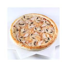 тесто для пиццы, сыр моцарелла, куриное филе, шампиньоны, сырный соус