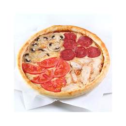 тесто для пиццы, сыр моцарелла, куриное филе, помидоры, шампиньоны, салями