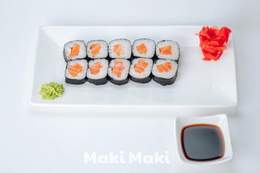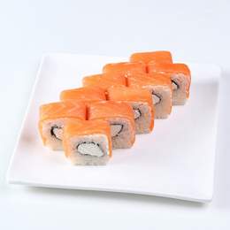 рис для суши, водоросли нори, лосось, сливочный сыр, огурец, стружка тунца