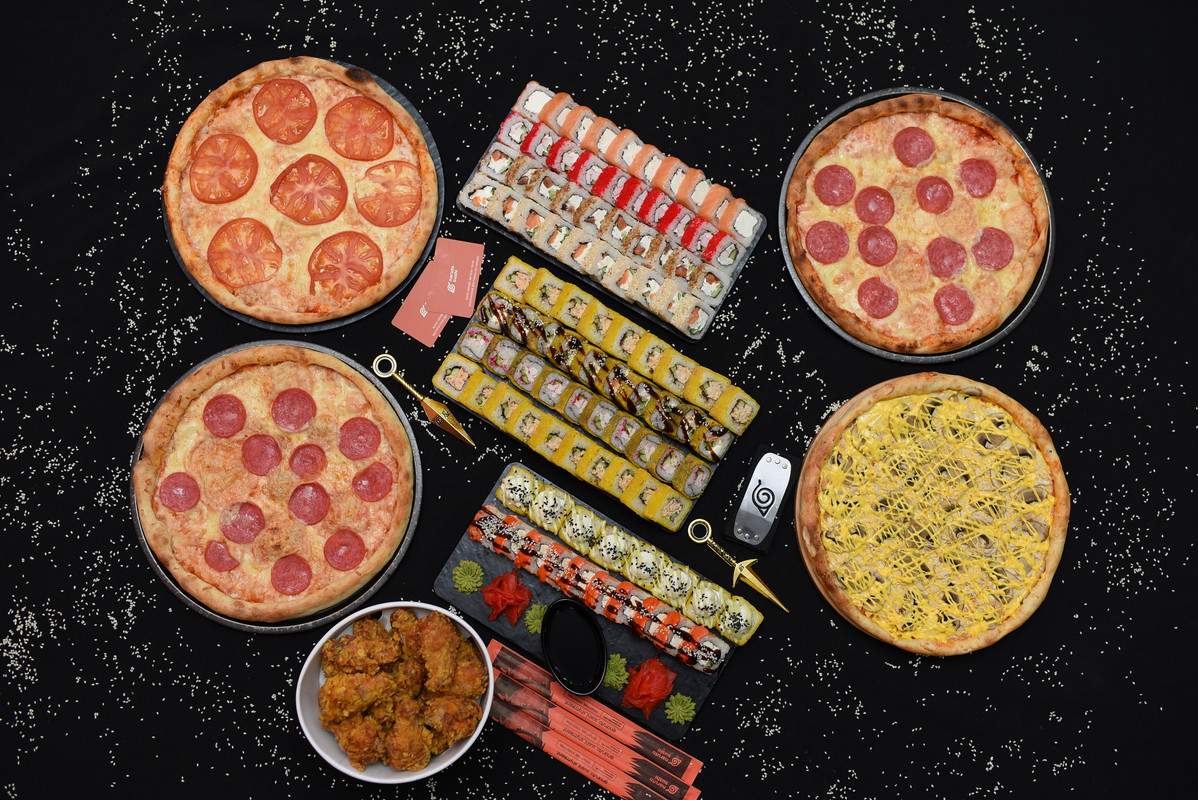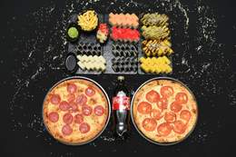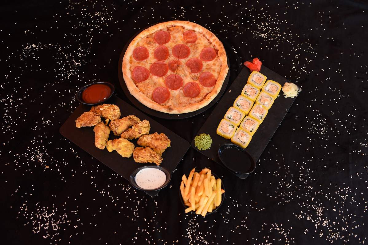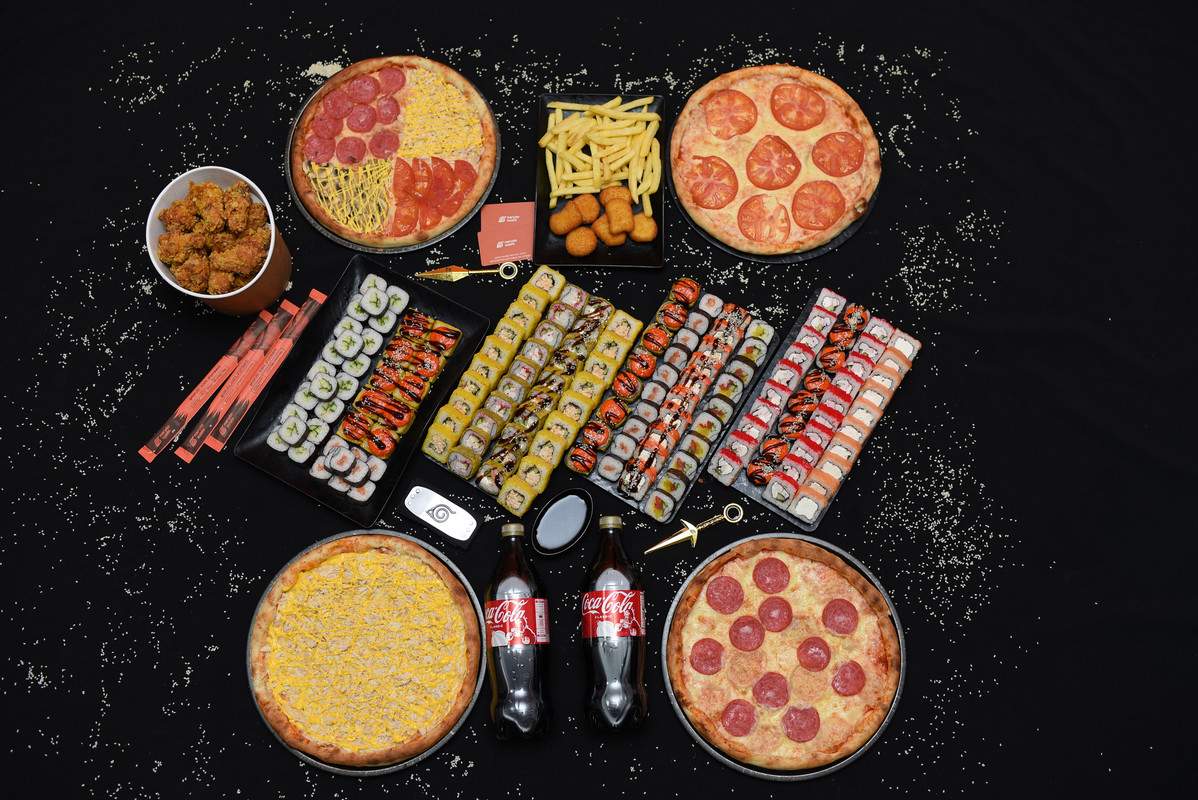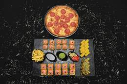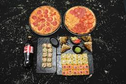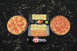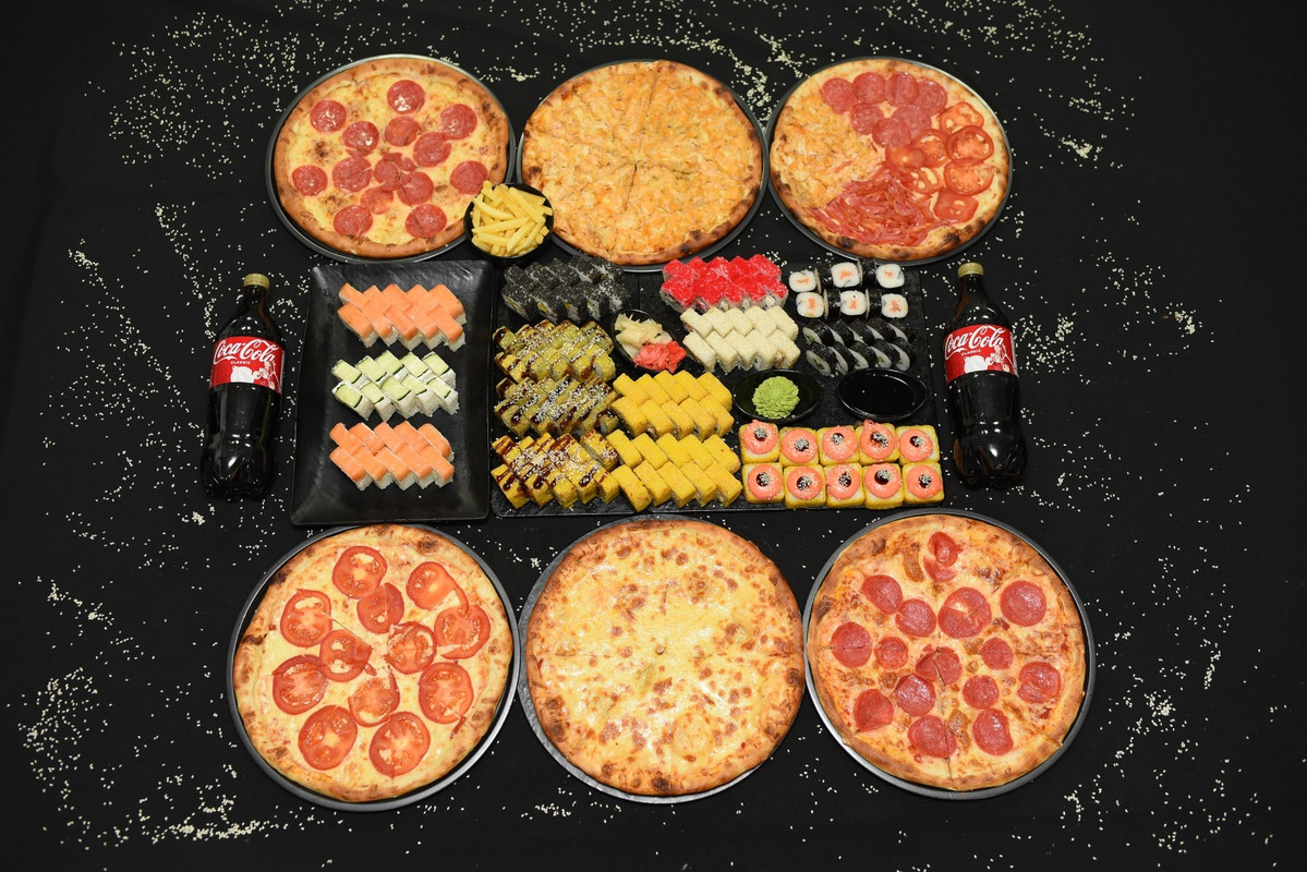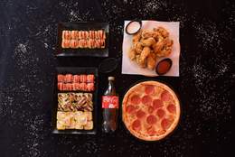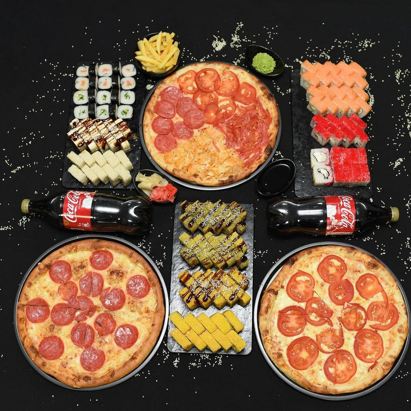 Филадельфия (20 шт.), Калифорния (20 шт.), Аляска (10 шт.), Капа (10 шт.), Саке ролл (10 шт.), Цезарь жареный (20 шт.),Темпура (20 шт.), Чиз ролл (10 шт.), Пицца "Пепперони", "Четыре сезона", "Маргарита", Картофель фри (200 гр.), Coca-Cola (2 л.)
