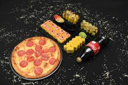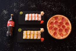 Темпура (10 шт.), Цезарь (10 шт.), Филадельфия (10 шт.), Капа (10 шт.), Сяке (10 шт.), Пицца "Пепперони", Coca-Cola в подарок (1 л.)