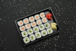 Филадельфия (10 шт.), Калифорния (10 шт.), Аляска (10 шт.), Капа (20 шт.), Сяке (10 шт.), Цезарь жареный (10 шт.), Темпура (30 шт.), Пепперони, Маргарита, картофель фри (1 порция), Coca-Cola (1 л.)