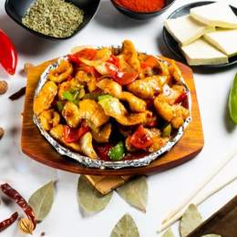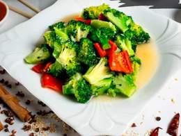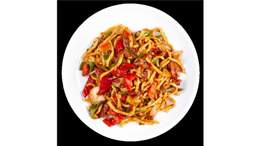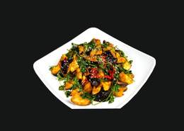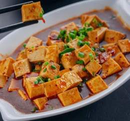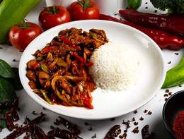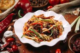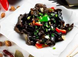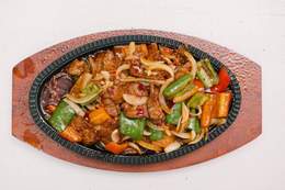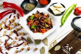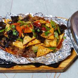 Тофу, говядина, древесные грибы, полугорький перец, лук.