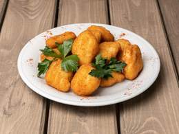 Обжаренные ломтики картофеля в панировке, с мясом и овощами