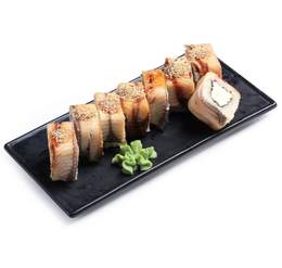 Угорь копченый, сливочный сыр, икра Масаго, огурец, соус Унаги, кунжут