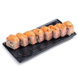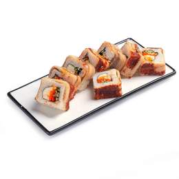 Запеченные роллы с жареным лососем (8 шт.), с копченной курицей (8 шт.), с огурцом (8 шт.), с майонезом и с икрой (8 шт.)