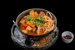наваристый восточный суп с мягкими кусочками говядины, свежими овощами, ароматными специями и насыщенным бульоном.