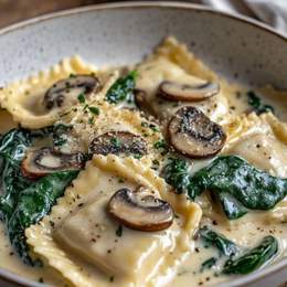 Raviolis fraîches garnis de champignons , cream , Parmesan