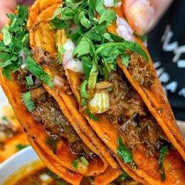 3 pieces ofTacos with red sauce and lemon and meat of your choice