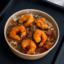 Riz parfumé, crevette croustillant, sauces maison curry, oignons crispy et persil frais. Un mélange croustillant et fondant, gourmand et ultra savoureux.