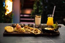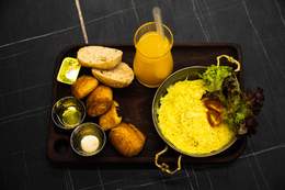 Jus naturel, boisson chaude, panier de viennoiserie, mquila d'œufs au fromage