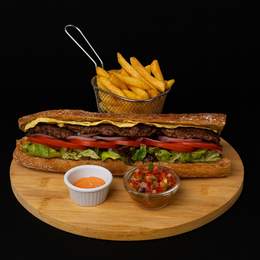 Baguette, viande hachée, salade, tomates, olives, œuf, sauce au choix