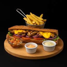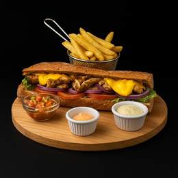 Baguette, poulet tenders, salade, tomate, oignons, sauce au choix