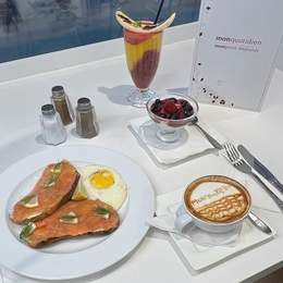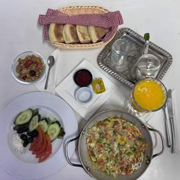 Panier de pain beldi, harira semoule, assortiment de msemen, baghrir, harcha, beurre, confiture maison, huile d'olive, omelette au khlii, amlou, miel d'atlas, jben, olives noires, yaourt aux fruits secs et miel, jus de fruits et boisson chaude