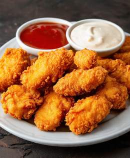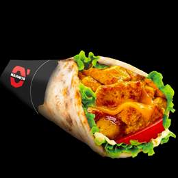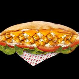 Escalope de poulet, sauce thaï piquante, 2 sauces au choix, garniture au choix, cheddar.