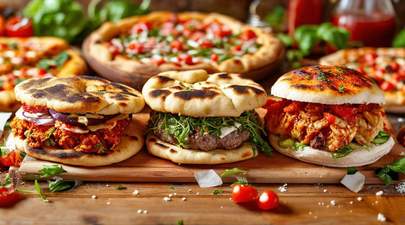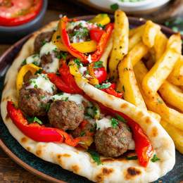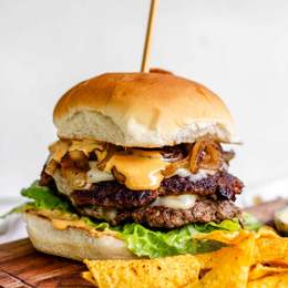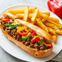 Viande hachée, 2 sauces au choix, garnitures au choix, poivron et oignon caramelisé, fromage cheddar.