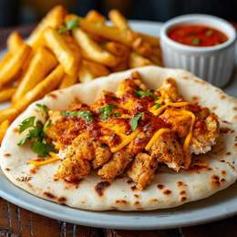 Escalope de poulet tandori, 2 sauces au choix,servi avec frites garnitures au choix, cheddar.
