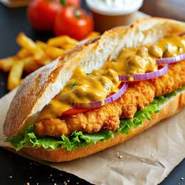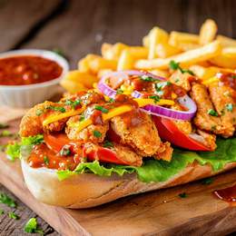 Escalope de poulet, sauce thaï piquante, salade, tomate, oignon, cheddar, frites
