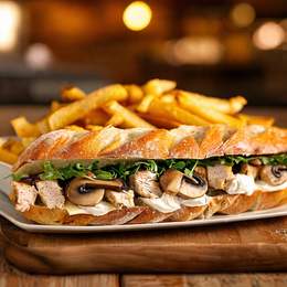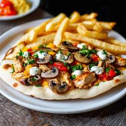 Poulet, 2 sauces au choix, garnitures au choix, champignon, crème fraîche, fromage cheddar.