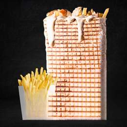 Viande hachée, Galette de pomme de terre, oignons confits, Frites maison, Sauce fromagère maison, Sauce BBQ, Gratiné gouda