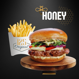 Steak du boucher, Fromage de chèvre, Miel, Salade, Tomate, Oignon, Sauce burger