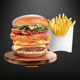 Steak du boucher, Tenders Crispy, Cheddar, Galette de pomme de terre, Bacon, Oignon confit, Salade, Tomate, Sauce maison