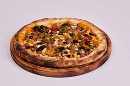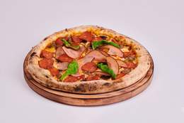 Viande hachée, pepperoni, jambon de dinde, poivrons, champignons de Paris, mozzarella, origan, coulis de tomates.