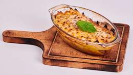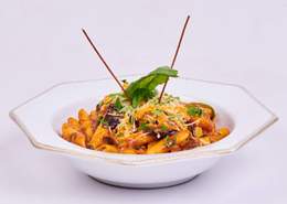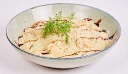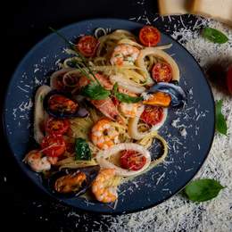 Cocktail de fruits de mer, champignons de paris, basilic, parmesan, crème fraîche.
