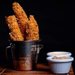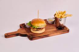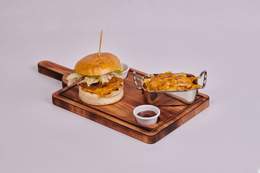Pain brioché, poulet croustillant pané aux corn flakes, bacon de bœuf, cheddar, iceberg, tomate, sauce BBQ maison.