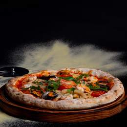 Cocktail de fruits de mer, champignons de Paris, mozzarella, origan, coulis de tomates.