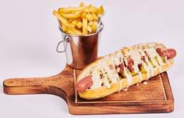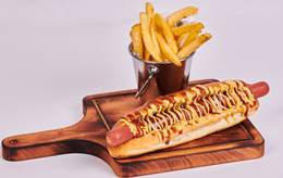 Pain brioché, saucisse de bœuf, ketchup, moutarde miel