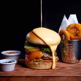 Pain brioché, Bœuf haché, Cheddar, Iceberg, Tomate, Avocat, Sauce maison.