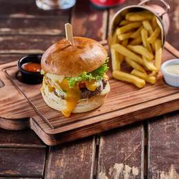 Pain brioché, bœuf haché, cheddar, iceberg, oignon, tomate, sauce maison.