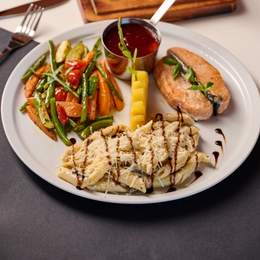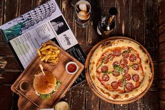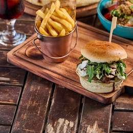 Pain brioché, bœuf haché, tomate séchée, mozzarella boule, roquette, réduction balsamique, sauce vintro.
