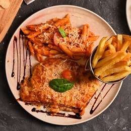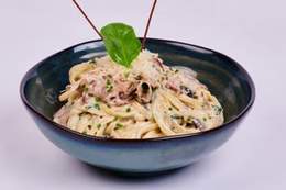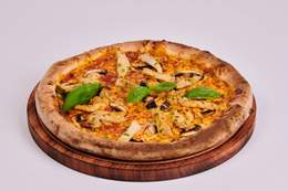 Blanc de poulet, champignons de paris, basilic, parmesan, crème fraîche.
