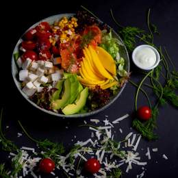 Mesclun de salade, saumon fumé, mais, feta, avocat, mangue, tomate cerise, sauce à l'aneth.